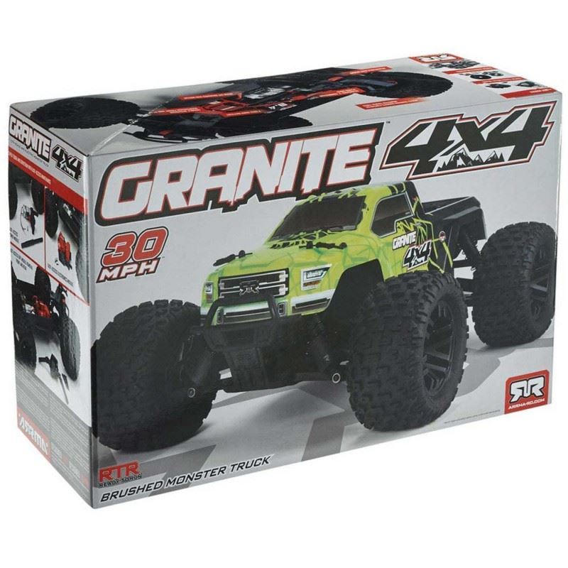 Powered by the MEGA 550 brushed motor system, the ARRMA® GRANITE™ 4X4 MEGA RTR Monster Truck is DESIGNED FAST, DESIGNED TOUGH — built for exciting bashing speeds and extreme, all-terrain durability! Its full-time 4WD transmission with front and rear differentials uses strong front, rear, and centerline telescopic driveshafts that can't be lost during heavy impacts, unlike dogbones. A simple, dependable, responsive steering assembly complements the ultra-reliable drive system and features a servo horn with built-in servo saver.