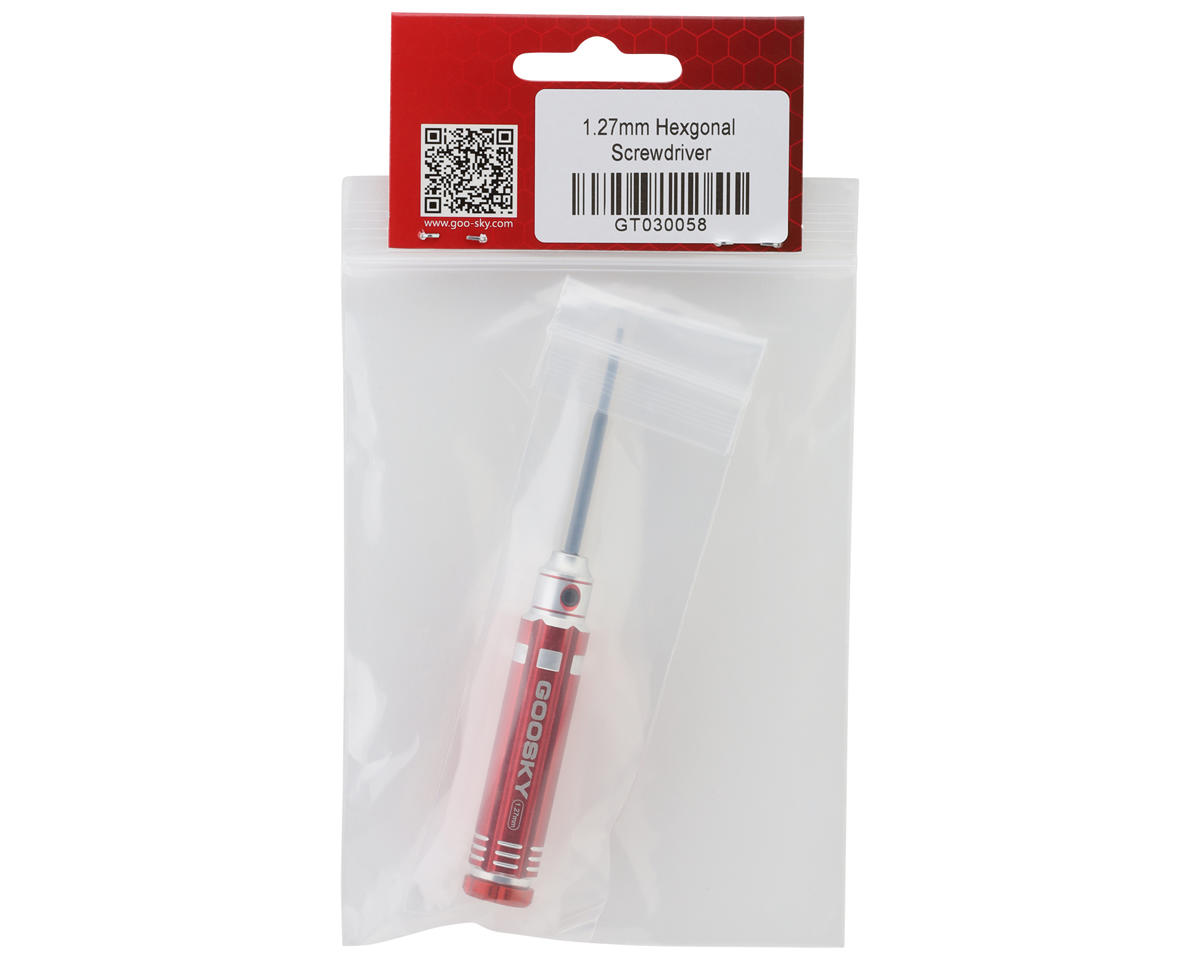This is a GooSky 1.27mm Hex Screwdriver. Features an all aluminum lightweight anodized handle with a short titanium coated tip that fits perfectly in tight applications such as Helicopters. Package includes one Hex screwdriver wrench.