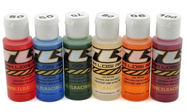 This is the Team Losi Racing Silicone Shock Oil Six Pack. This multi-pack includes six 2oz bottles of 50wt, 60wt, 70wt, 80wt, 90wt, and 100wt oil. Losi shock oil is made from 100% pure silicone oil and will not thin out in hot weather or thicken up in cold weather. The higher the weight number of the oil, the thicker the oil is. Losi shock oil is generally slightly thicker than Team Associated shock oil with the same 'weight' rating.