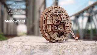 As to the technical characteristics: the Ugears Monowheel kit comes with 300 parts, including 19 spare parts. The assembled model measures at 185 х 95 х 160 mm and like all Ugears family models, it’s made of high grade wood and has everything you will need for assembly. The quality of the parts is top-notch: a laser method is used for cutting items from a plywood board that provides precise hairline cuts. The details have to be pulled out of the boards and assembled to create a complete model. Like all other Ugears models, the Monowheel comes with step-by-step, full-color, truly easy to follow instructions in 11 languages (English, German, Ukrainian, French, Polish, Spanish, Russian, Japanese, Italian, Chinese and Korean) and requires neither glue nor special tools to be fully assembled into functional Monowheel.